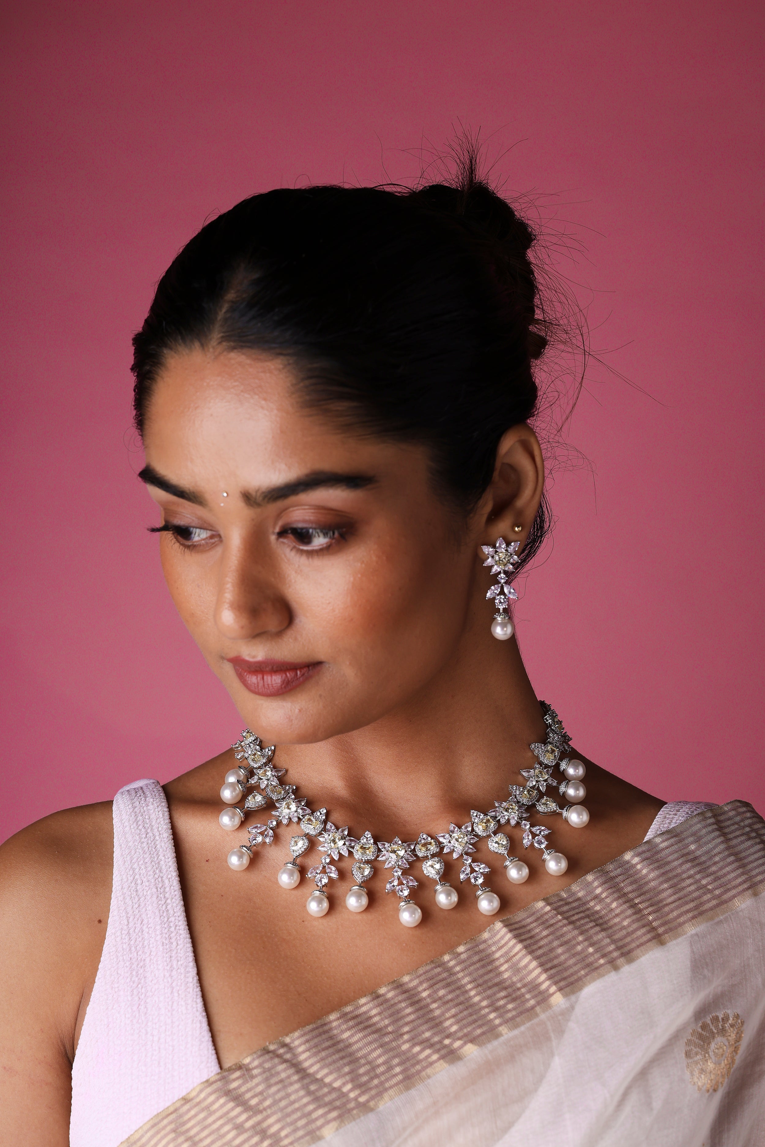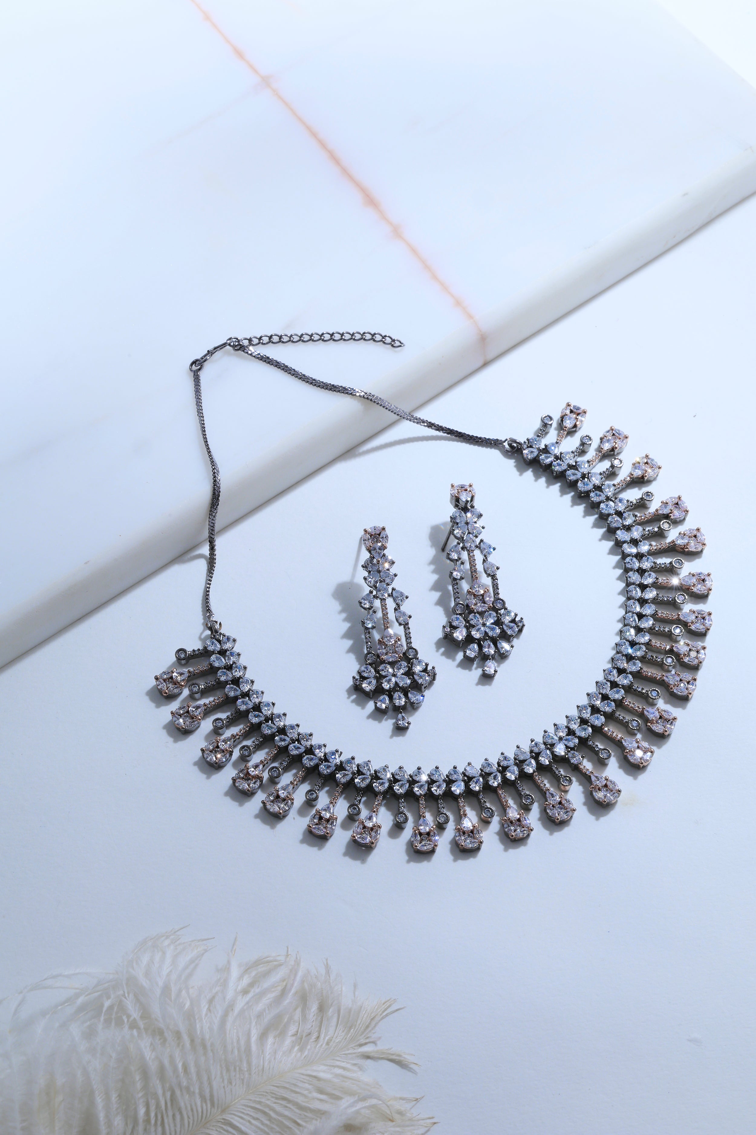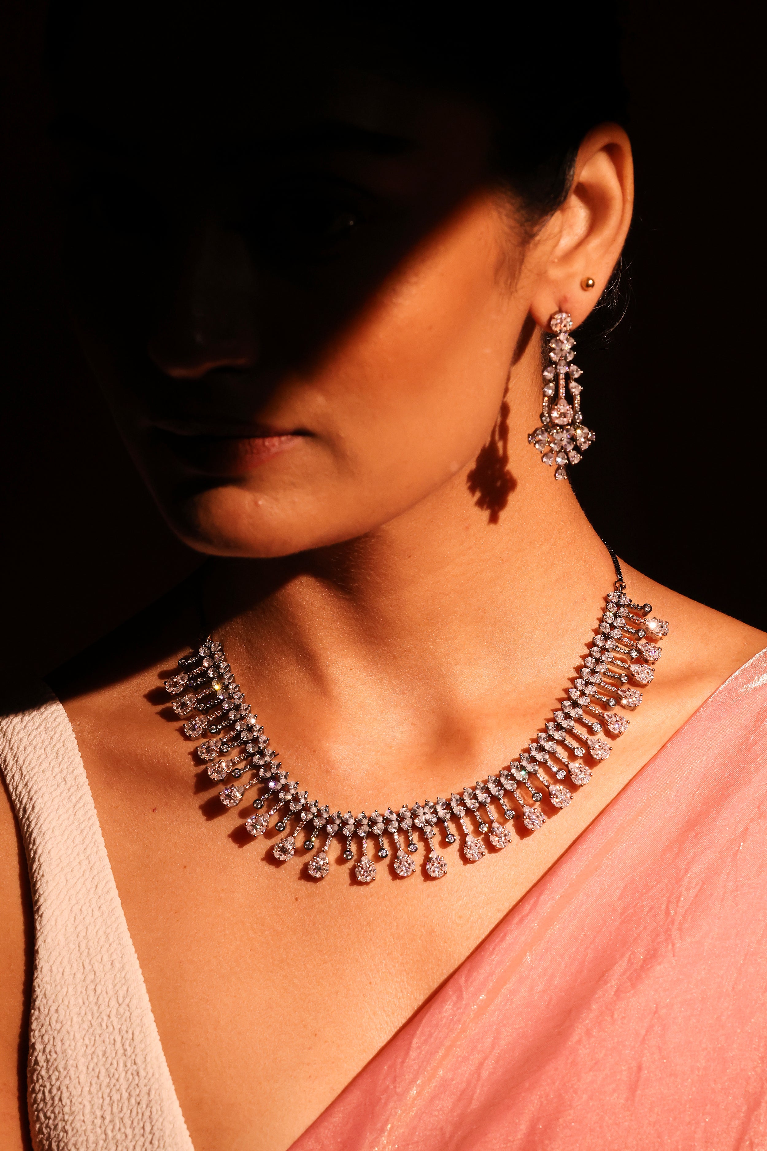 Diamonds represent eternal love, making them the perfect choice for bridal jewellery. From pave diamond bridal sets to bridal diamond necklace sets with fancy cut diamonds in black rhodium, our pieces sparkle with sophistication. Every diamond is ethically sourced and meticulously set to catch the light with brilliance.