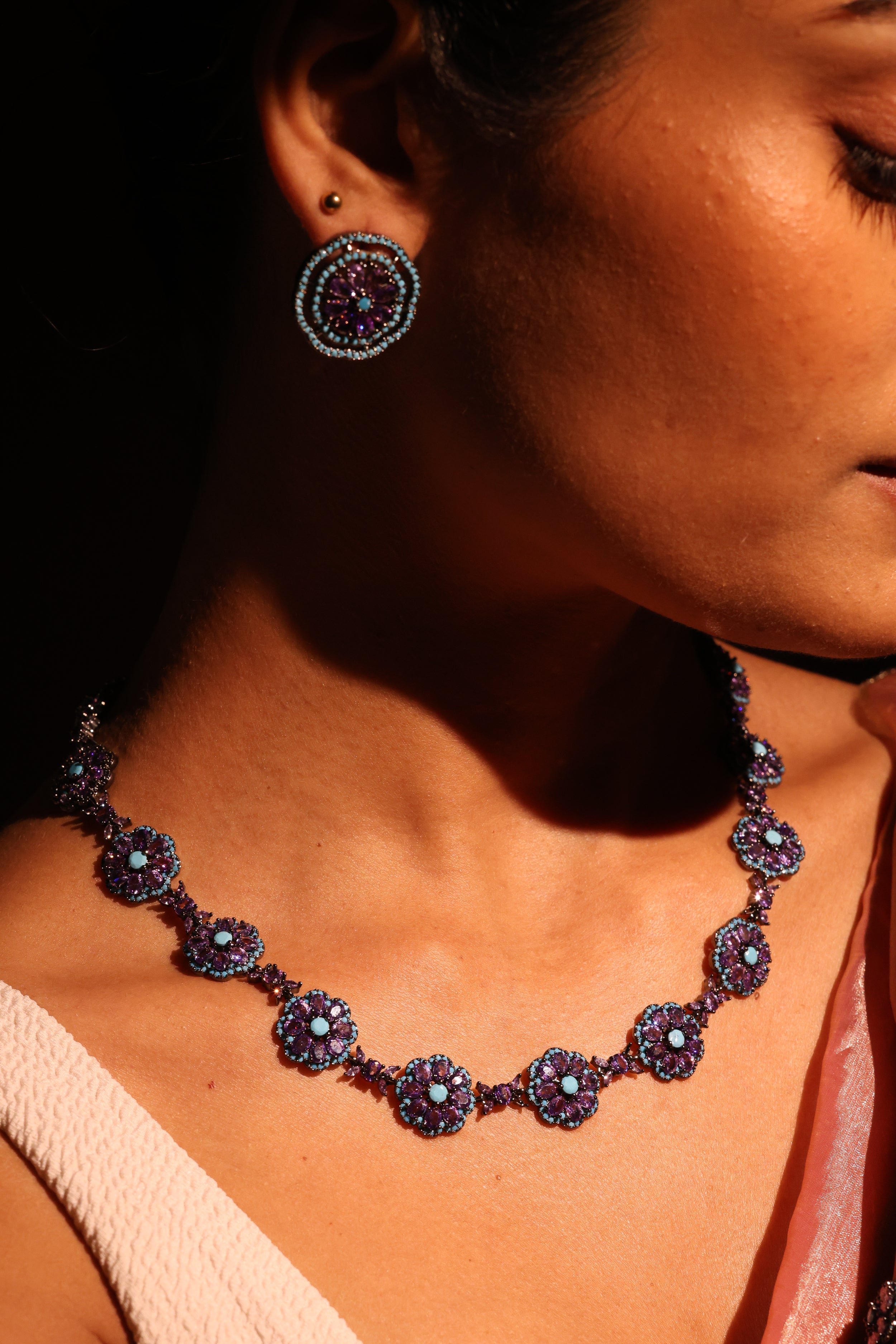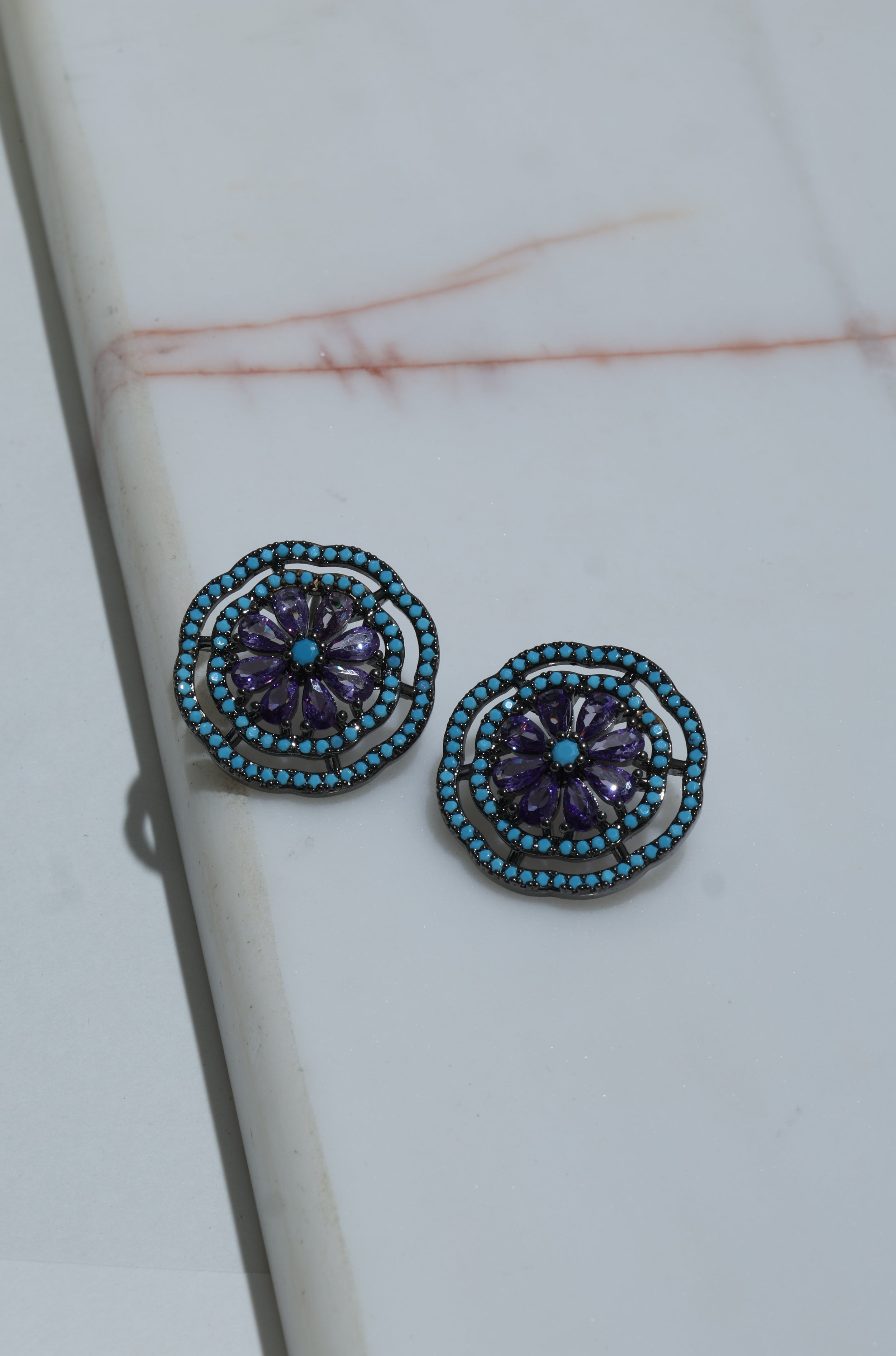 - Amethyst & Turquoise Black Rhodium Stud Earrings – A bold blend of amethyst and turquoise set in striking black rhodium.