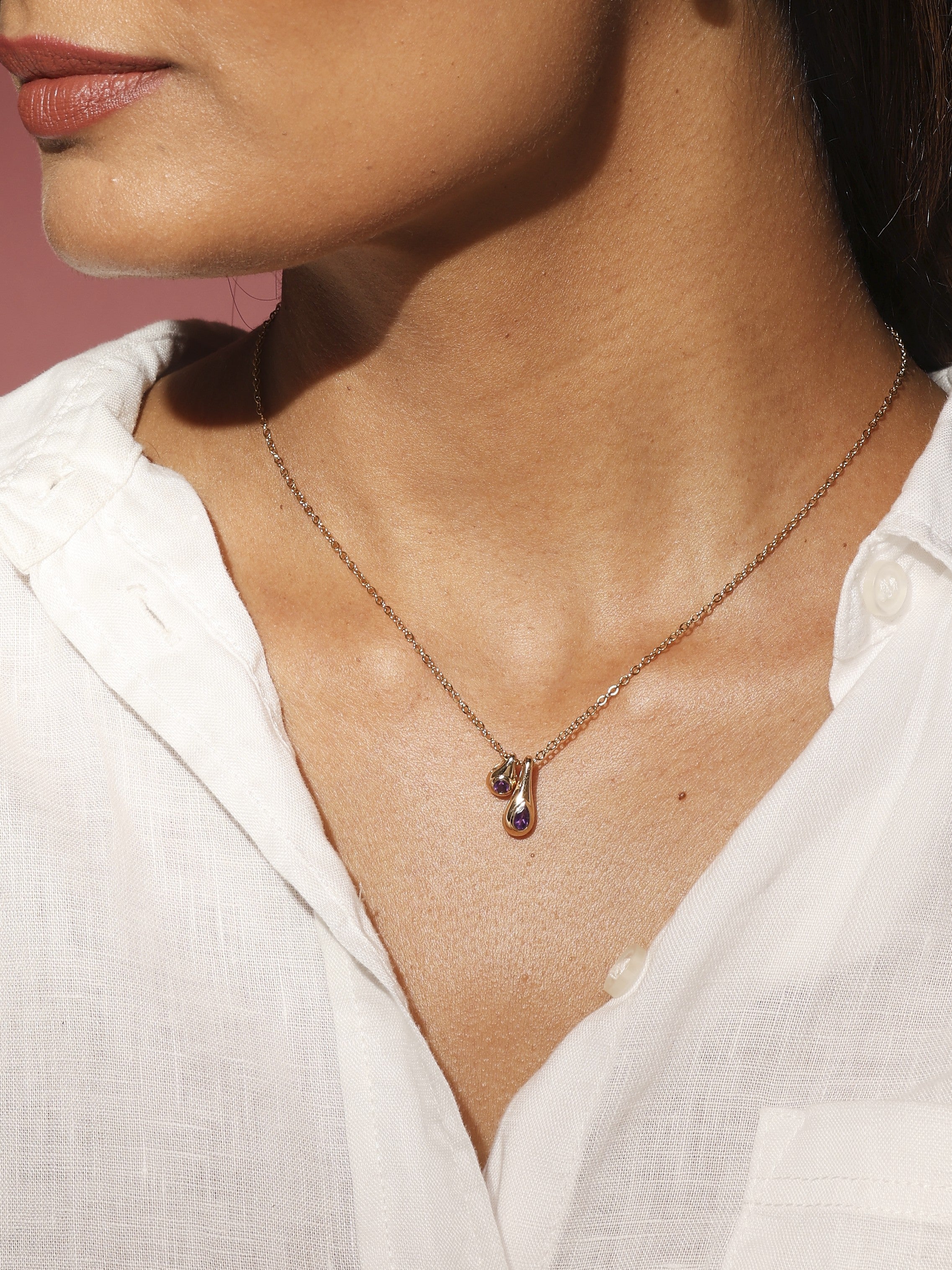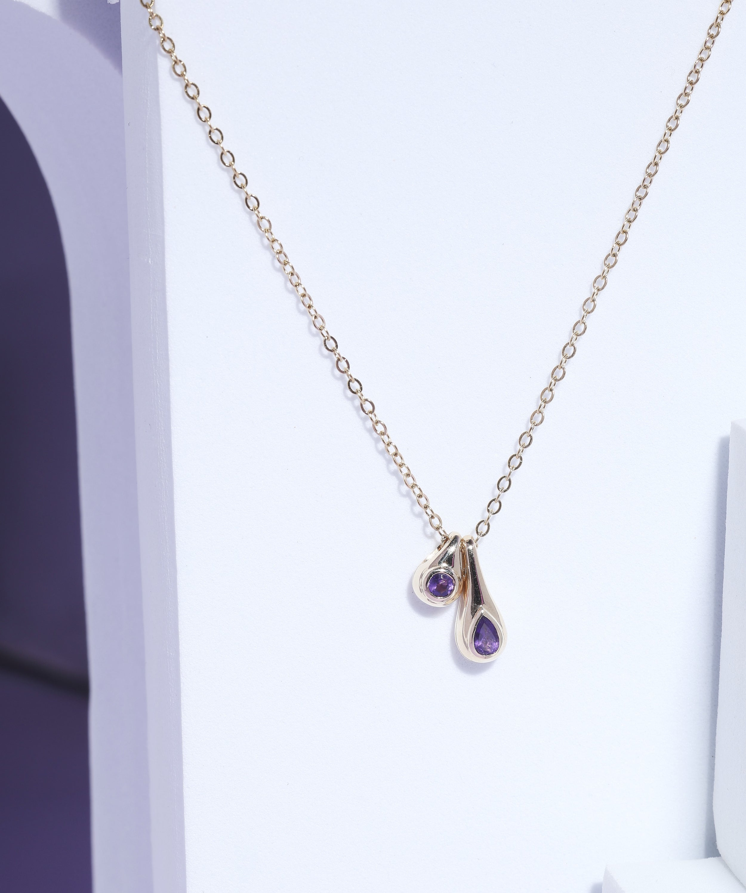 - Amethyst Drop 14k Gold Necklace – The regal purple of amethyst brought to life in a graceful drop necklace.