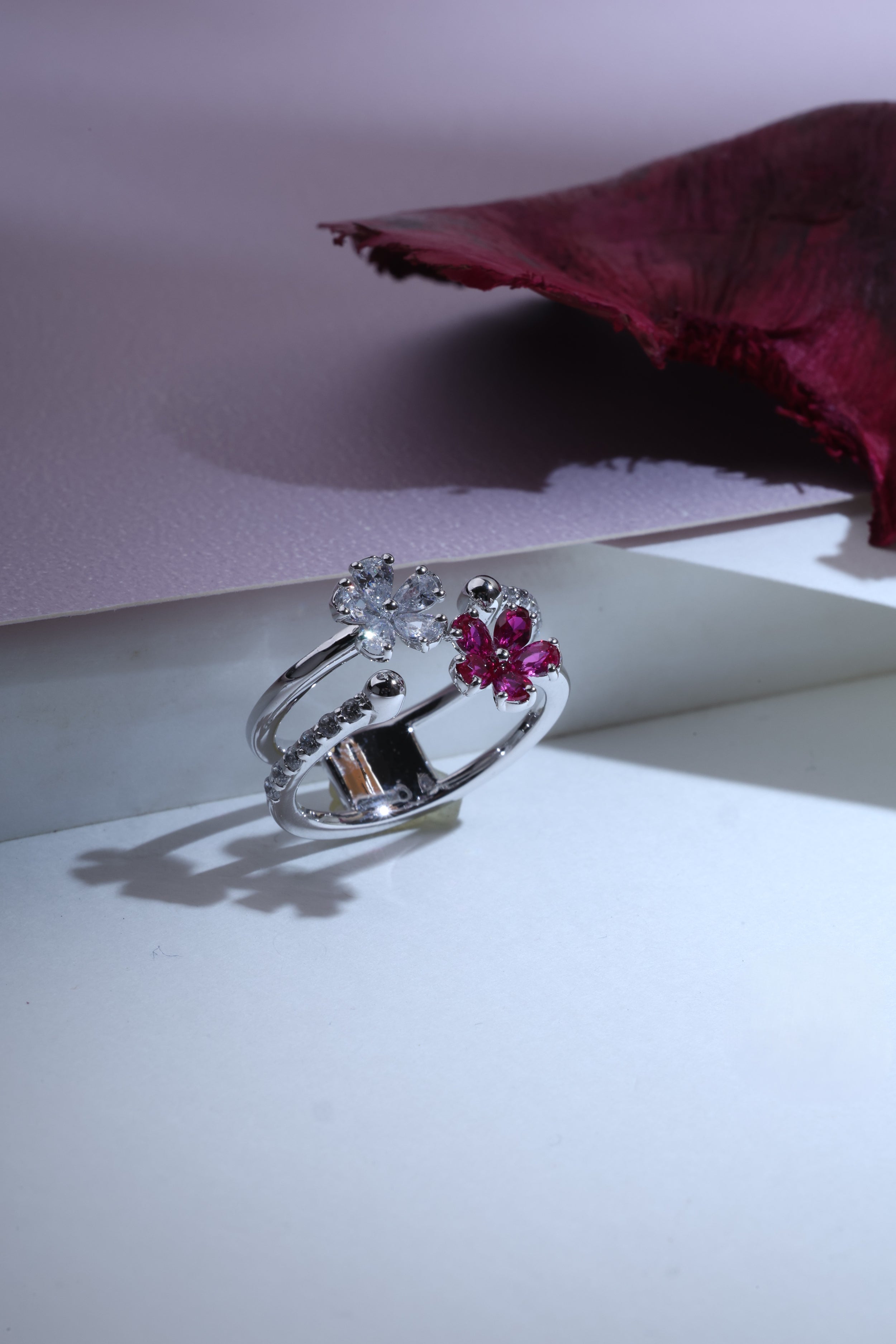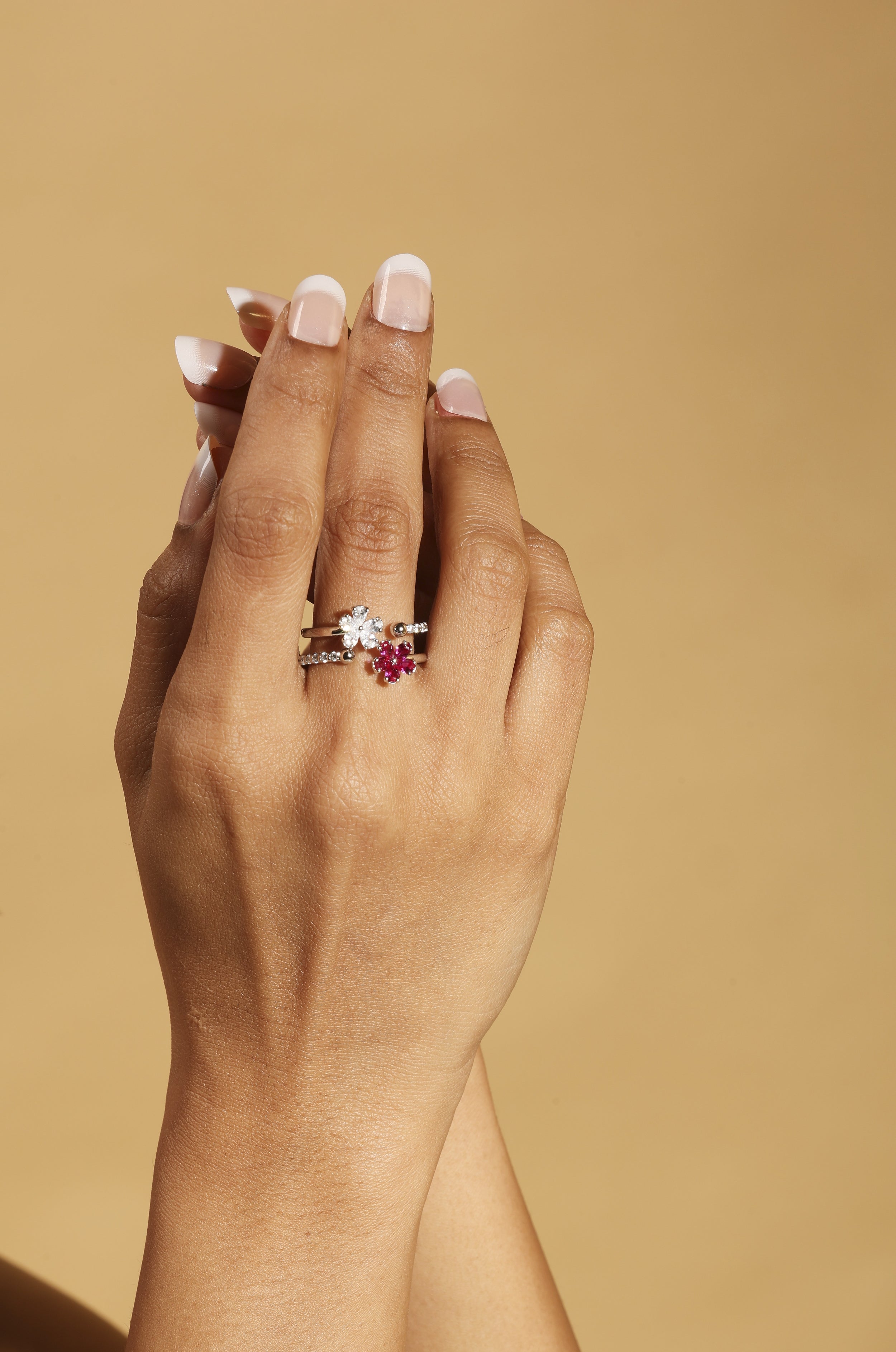 - Ruby and Diamond Double Band Flora Ring – A floral-inspired beauty with ruby accents and diamond brilliance.
